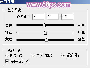 5、创建色彩平衡调整图层,对阴影,高光进行调整,参数设置如图20,21,效果如图22。这一步微调图片暗部及高光部分的颜色。