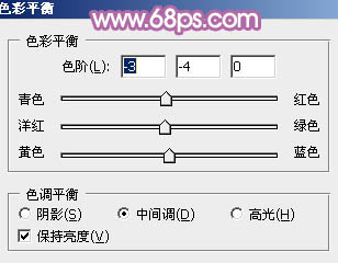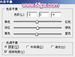 12、创建色彩平衡调整图层,对阴影、中间调、高光进行调整,参数设置如图35 - 37,效果如图38。这一步给图片暗部及高光部分增加蓝色。