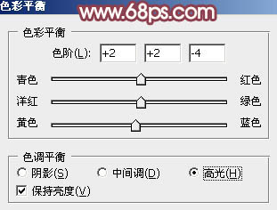 6、创建色彩平衡调整图层,对阴影,高光进行调整,参数设置如图16,17,效果如图18。这一步加强图片暗部及高光部分的颜色。