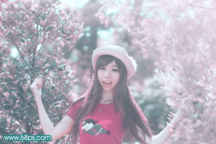 素材图片基本上以黄绿色为主,只是暖色部分还不够明显,前期需要给图片增加暖色,然后把图片转为青红双色图片,后期再把红色转为淡紫色,青色稍微调亮即可。
