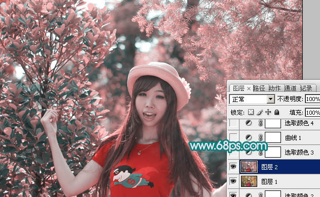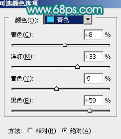 4、创建可选颜色调整图层,对红,青进行调整,参数设置如图7,8,效果如图9。这一步主要把红色转为紫红色。