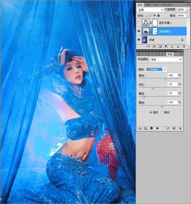 3、这张照片的重点在于调整环境色,原片中的环境色偏深蓝色,略显沉重,给不了我们想要梦幻和神秘。通过可选颜色,调整青色和蓝色,让照片中的深蓝色变成湖蓝色。