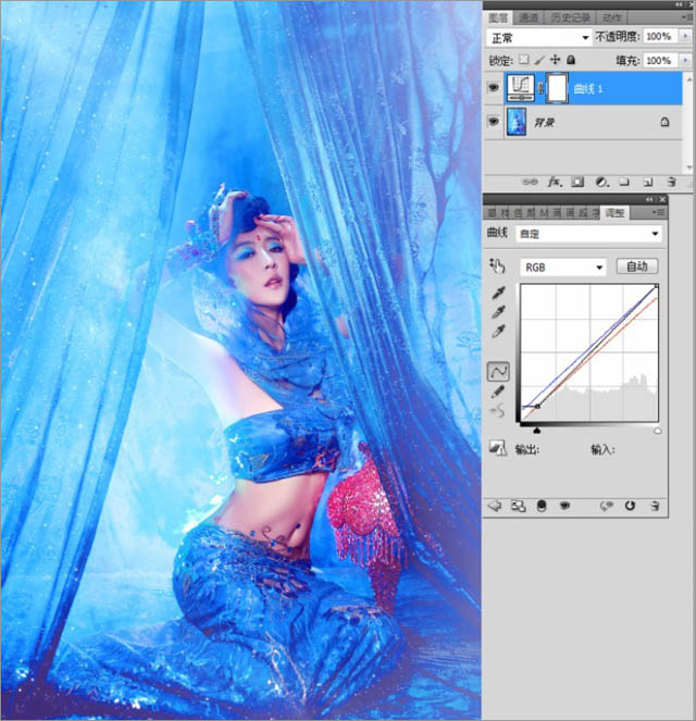 6、到这里,画面的整体感觉基本上出来了,但是略显平,空间感不足,通过曲线工具来塑造空间感以及微调肤色。为了使照片的整体感觉更加梦幻,加入了小星光的元素。
