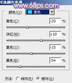 9、创建可选颜色调整图层,对青、洋红、黑进行调整,参数设置如图24 - 26,效果如图27。这一步主要把图片中的青色调淡。