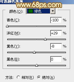 3、创建可选颜色调整图层,对红、黄、绿、青、白、黑进行调整,参数设置如图4 - 9,效果如图10。这一步把图片中的绿色转为橙黄色。
