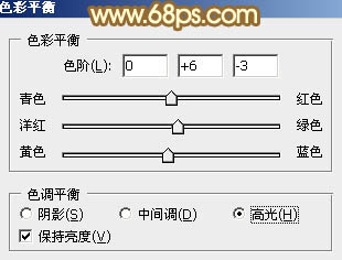13、创建色彩平衡调整图层,对中间调,高光进行调整,参数设置如图36,37,确定后按Ctrl + Alt + G 创建剪切蒙版,效果如图38。这一步微调人物肤色。