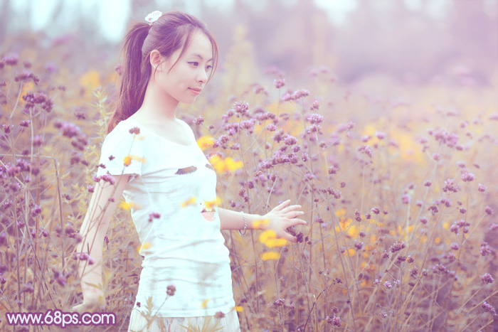 素材图片花朵部分是紫色,调色的时候只需要再把图片暗部转为紫色,绿叶部分转为橙黄色,然后把暗部调亮,高光部分颜色调淡即可。