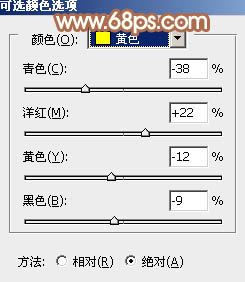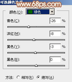 1、打开素材图片,创建可选颜色调整图层,对黄,绿进行调整,参数设置如图1,2,效果如图3。这一步给图片背景增加橙黄色。
