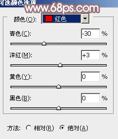 1、打开素材图片,先创建可选颜色调整图层,对红、黄、绿进行调整,参数设置如图1 - 3,效果如图4。这一步给图片增加红色,并把背景部分的颜色调亮一点。