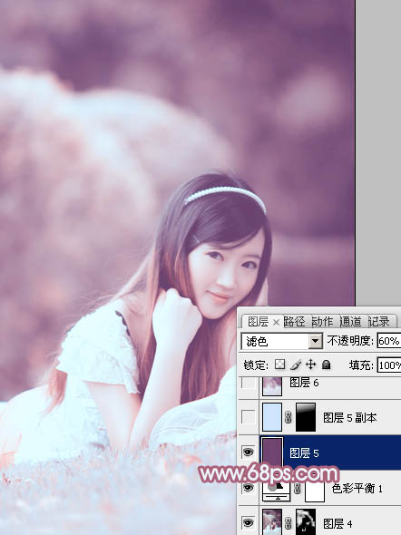 15、新建一个图层,填充红紫色:#724570,混合模式改为“滤色”,不透明度改为:60%,效果如下图。这一步增加图片亮度,并增加红色。