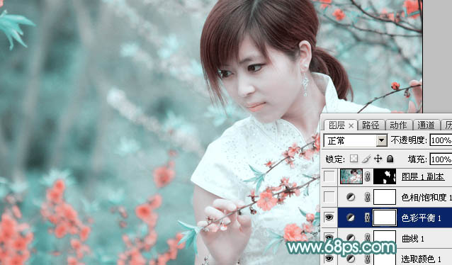 Photoshop给桃花中的美女加上清爽的古典淡青色(3)