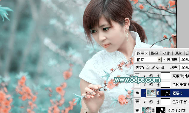 Photoshop给桃花中的美女加上清爽的古典淡青色(5)
