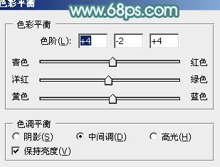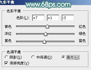 9、再创建色彩平衡调整图层,对阴影、中间调、高光进行调整,参数设置如图21 - 23,确定后按Ctrl + Alt + G 创建剪贴蒙版,效果如图24。这一步微调人物肤色。