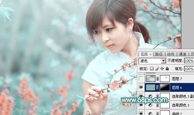 Photoshop给桃花中的美女加上清爽的古典淡青色(8)