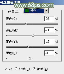 7、创建可选颜色调整图层,对绿,青进行调整,参数设置如图20,21,效果如图22。这一步微调主色。