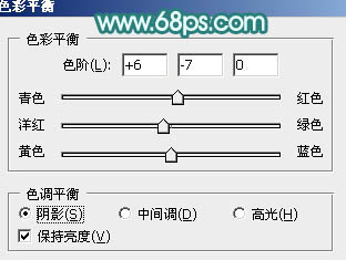 14、创建色彩平衡调整图层,对阴影,中间调进行调整,参数设置如图34,35,确定后把图层不透明度改为:50%,效果如图36。这一步微调图片高光及暗部颜色。