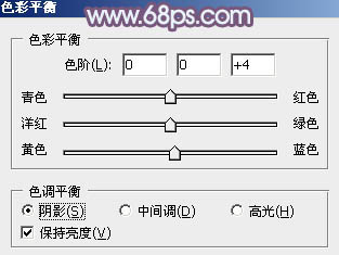 8、创建色彩平衡调整图层,对阴影,高光进行调整,参数设置如图24,25,确定后把图层不透明度改为:30%,效果如图26。这一步微调图片暗部及高光部分的颜色。