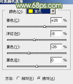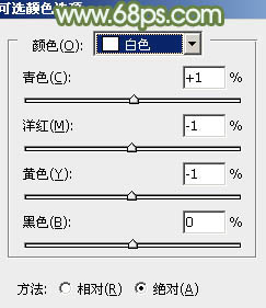 7、创建可选颜色调整图层,对黄、绿、白进行调整,参数设置如图17 - 19,效果如图20。这一步主要把图片中的绿色调淡。