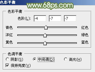 13、创建色彩平衡调整图层,对中间调,高光进行调整,参数设置如图32,33,效果如图34。这一步把图片颜色调柔和。