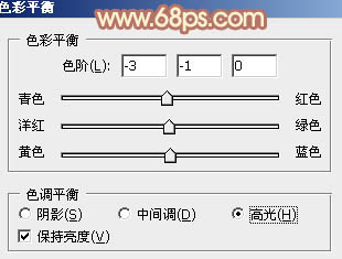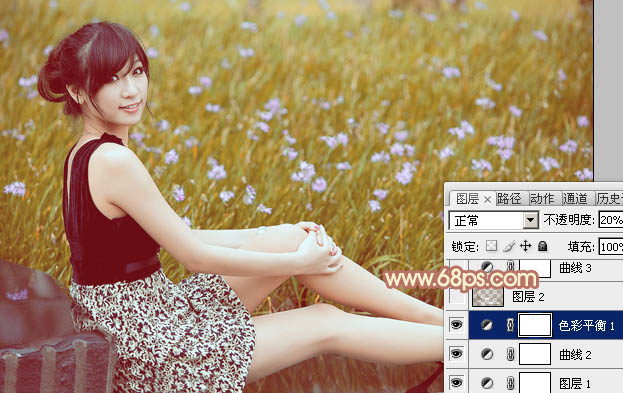 6、创建色彩平衡调整图层,对阴影、中间调、高光进行调整,参数设置如图17 - 19,确定后把图层不透明度改为:20%,效果如图20。这一步微调图片颜色。