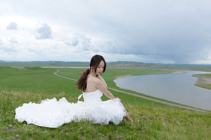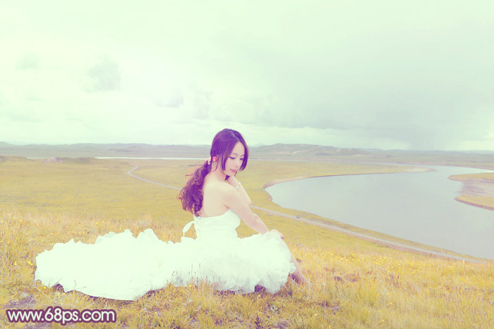 素材图片有点偏暗,主色以绿色及蓝色为主。调色的时候需要把草地部分的颜色转为橙黄色,天空部分的颜色转为青绿色,暗部再加上深蓝色即可。