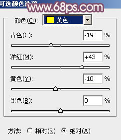 1、打开素材,创建可选颜色调整图层,对黄色进行调整,参数及效果如下图。这一步把图片中的黄色转为橙红色与绿色色差拉大。