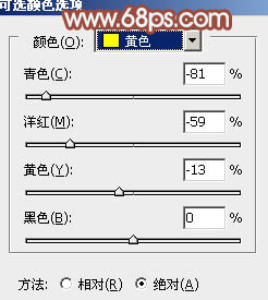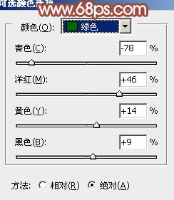 4、创建可选颜色调整图层,对黄、绿、青、中性色进行调整,参数设置如图10 - 13,效果如图14。这一步减少背景部分的绿色,增加红褐色。