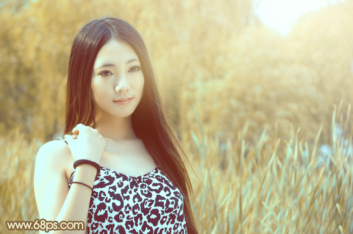 素材图片颜色比较单一,转为黄褐色是比较快的,把背景部分的主色转为橙黄色或淡黄色,暗部的颜色转为褐色,再微调一下人物肤色及高光部分的颜色即可。