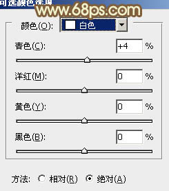 11、创建可选颜色调整图层,对红、黄、白进行调整,参数设置如图34 - 36,效果如图37。这一步主要给图片高光部分增加淡青色。