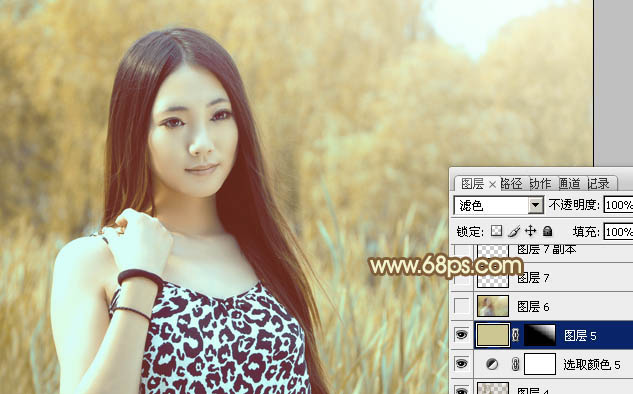 12、新建一个图层填充黄灰色:#CCC692,混合模式改为“滤色”,按住Alt键添加图层蒙版,用白色画笔把右上角部分擦出来,效果如下图。