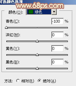 1、打开素材图片,创建可选颜色调整图层,对绿色进行调整,参数设置如图1,效果如图2。这一步把背景中的绿色转为黄绿色。