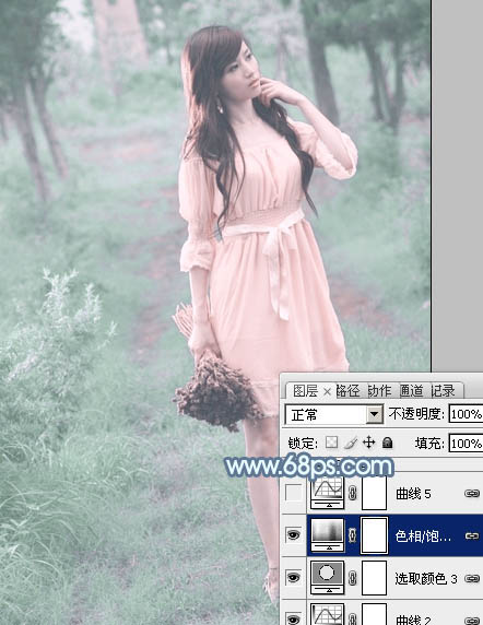 7、创建色相/饱和度调整图层,对青色进行调整,参数设置如图14,效果如图15。这一步把图片中的青色转为青绿色。