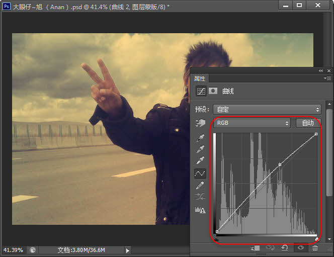 14、创建曲线调整图层,选择RGB,稍微提高照片亮度,如图。