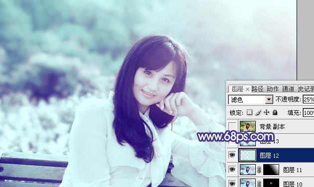 15、按Ctrl + Alt + 2 调出高光选区,新建一个图层填充淡青色:#C5ECED,混合模式改为“滤色”,不透明度改为:25%,效果如下图。这一步增加图片亮度。