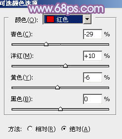 8、创建可选颜色调整图层,对红、白、中性、黑进行调整,参数设置如图18 - 21,效果如图22。这一步微调图片主色。