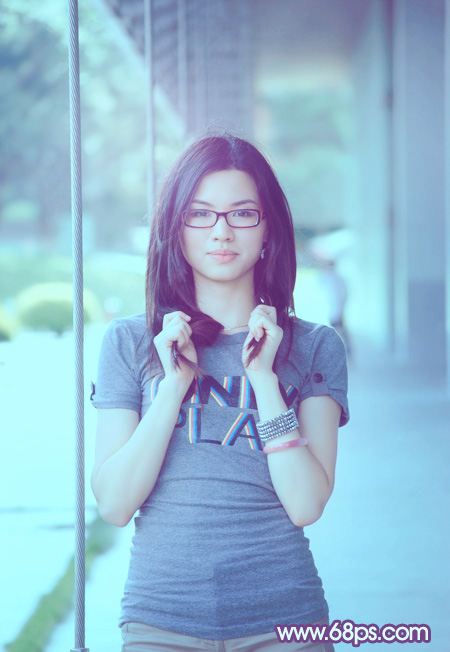 青蓝色是常用的颜色,比较适合外景图片调色。大致过程:先把图片适当调亮,并在暗部在增加蓝色,然后在高光及中间调部分增加一些青蓝色,后期再简单美化人物即可。
