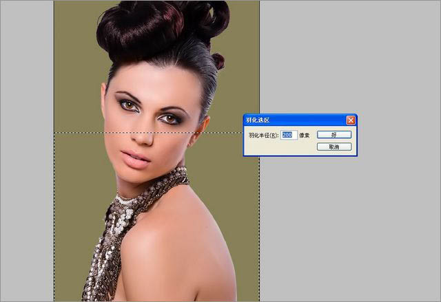 7、新建图层,用工具栏里的M画圆工具画一个选区,执行羽化200像素,羽化是根据照片的大小相应的调整羽化值得。