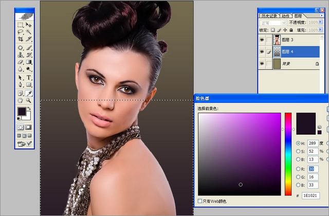 8、新建图层用工具栏里的M工具画一个选区填充暗紫色调,制造更好的过度效果。
