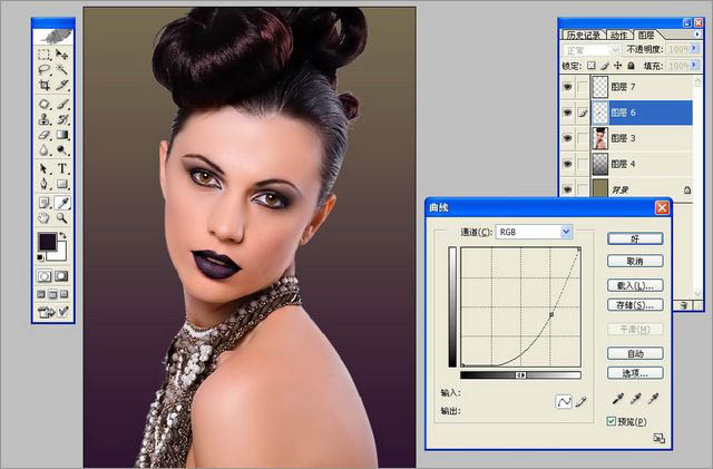 12、对复制出来的嘴唇图层进行曲线RGB压暗,调整好效果。