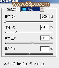 3、创建可选颜色调整图层,对红、黄、青进行调整,参数设置如图10 - 12,效果如图13。这一步同样给图片增加红色。