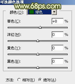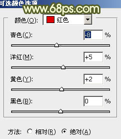 4、创建可选颜色调整图层,对红、黄、绿进行调整,参数设置如图11 - 13,效果如图14。这一步给图片增加红色。