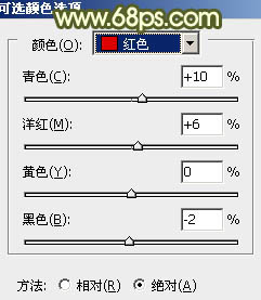 6、创建可选颜色调整图层,对红,黄进行调整,参数设置如图19,20,效果如图21。这一步主要降低图片中红色亮度。