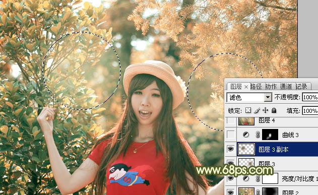 11、新建一个图层,混合模式改为“滤色”,把前景颜色设置为暗黄色:#887751,用画笔把下图选区部分涂上高光。
