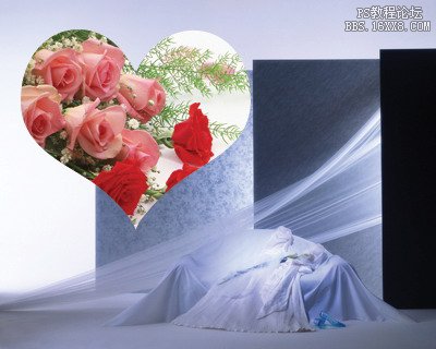 还有一类蒙版的使用,并非出于抠图目的,而是出于布局的目的。这类蒙版在建立后一般都会解除与图层的链接,以便于独立移动。如下图,在一个婚纱的背景图像中需要一个心形区域,并在这个心形区域中加入玫瑰花。因此就在玫瑰花图层上建立了一个心形的蒙版。