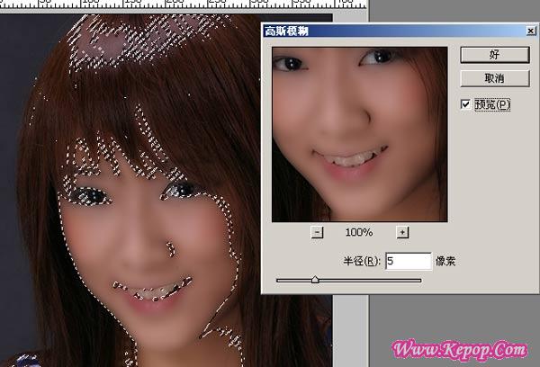 7. 在打开的“高斯模糊”对话框中,调节半径的像素值,得到合适的皮肤模糊程度,如图07所示。具体数值根据图像的像素尺寸大小而不同,本例用的图示为397X600像素尺寸,使用的是5个像素的模糊半径。