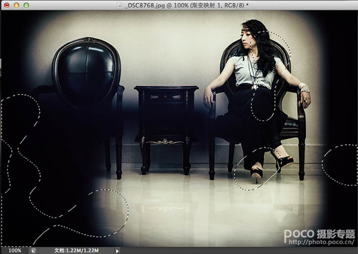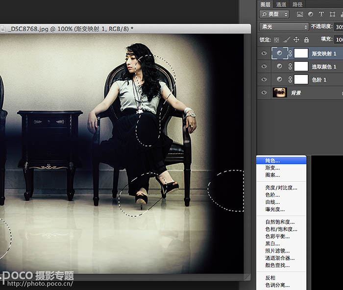 在前期拍摄中利用遮挡给图片四周加上暗角,打造出这种类似前景的效果,先圈出想要叠加色彩的区域,这个类似画画,没有美术功底的要多练习。