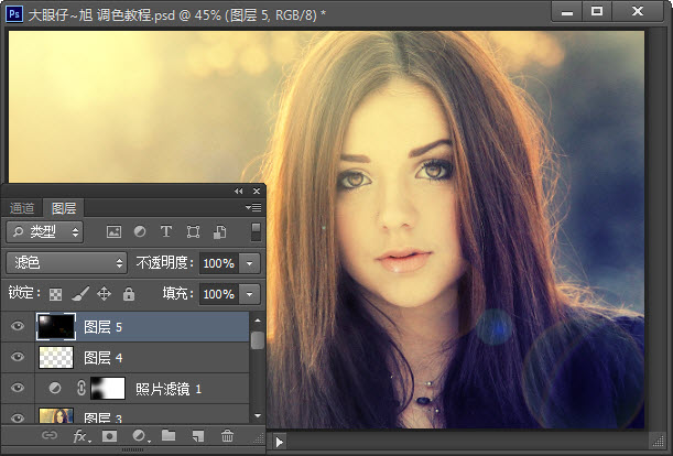 12、设置该图层的混合模式为滤色,这一步是制作镜头效果,如图。