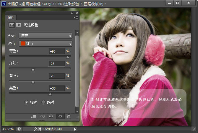 2、创建可选颜色调整图层,选择红色,继续对衣服的颜色进行调整。