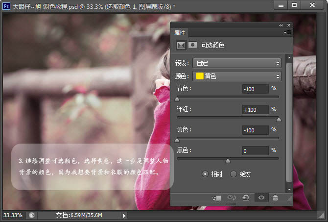 3、继续调整可选颜色,选择黄色,这一步是调整人物背景的颜色,因为我想要背景和衣服的颜色匹配。