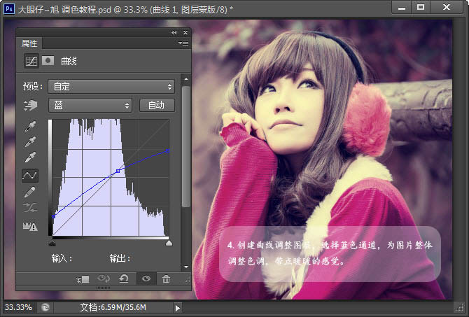 4、创建曲线调整图层,选择蓝色通道,为图片整体调整色调,带点暖暖的感觉。